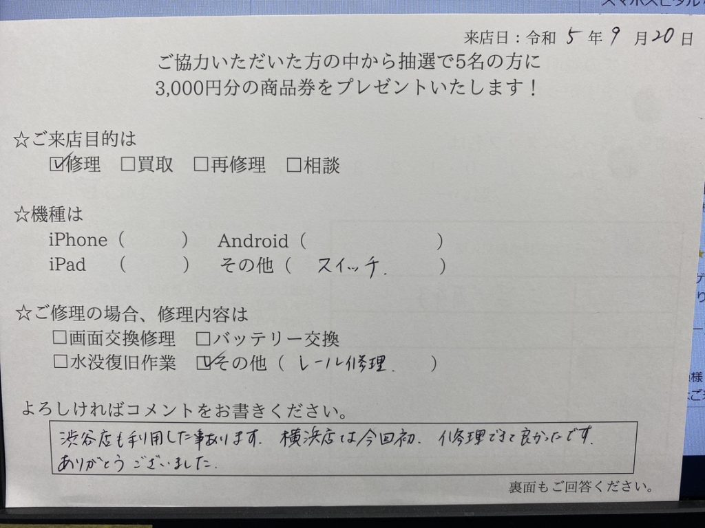渋谷店も利用したことあります。横浜店は今回初、修理できてよかったです。 ありがとうございました。