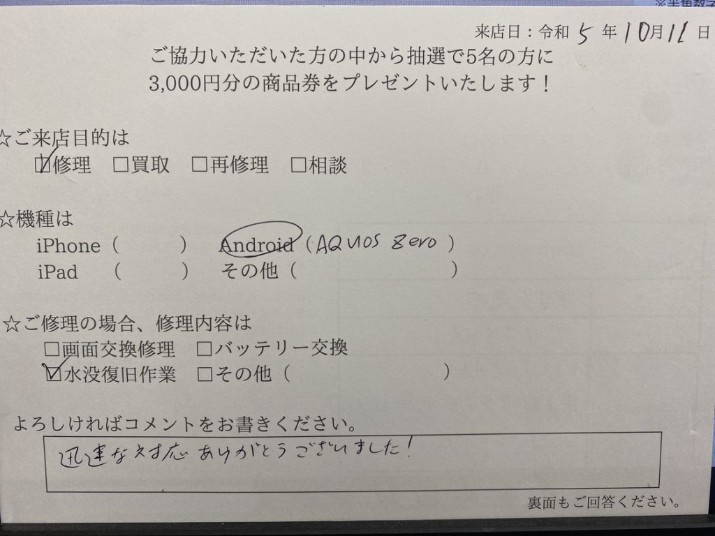 水没させてしまってから数時間は使えたけど持ってきたときには一切使用できない状態でした。古い端末の為諦め半分でしたがデータもある状態で戻ってきたため良かったです!当日で修理して頂きありがとうございました!
