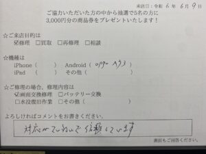 OPPO A73が走っている途中で落としてしまい画面が割れて表示が出来なくなってしまいましたが画面の修理をしていただきました。対応が丁寧で信頼しています。