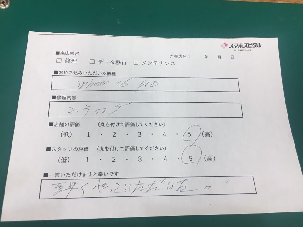 スマホスピタル横浜駅前 【iPhone16Pro】お客様よりコメントを頂きました!