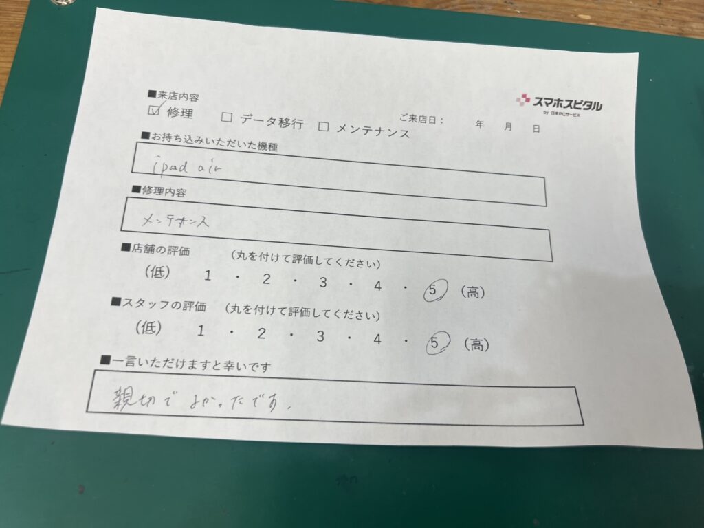 スマホスピタル横浜駅前 【iPadAir2】お客様よりコメントを頂きました!
