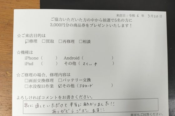 弊社の修理サービスをご利用いただいきましたお客様の声です。