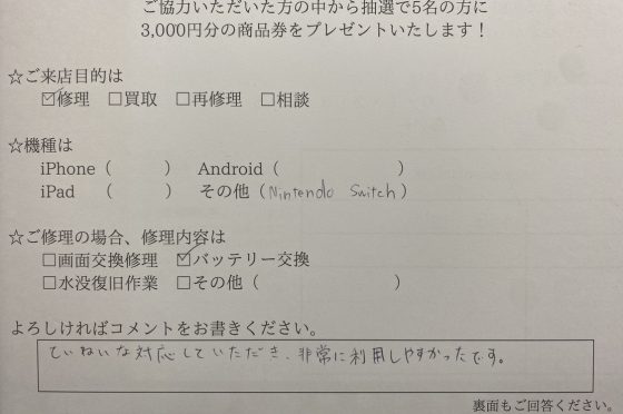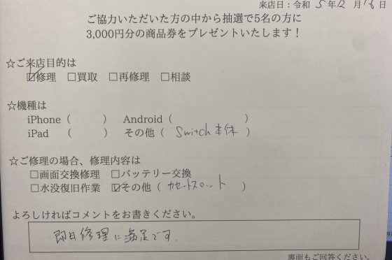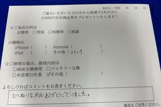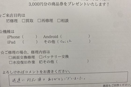 【Switch】飛び込みでも快く修理してくださいました!