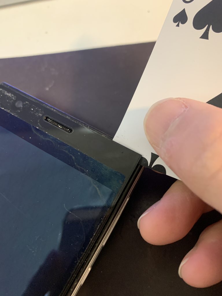 次に、画面とフレームの隙間にトランプなどを挿しこみ、少しずつ粘着テープを切っていきます。