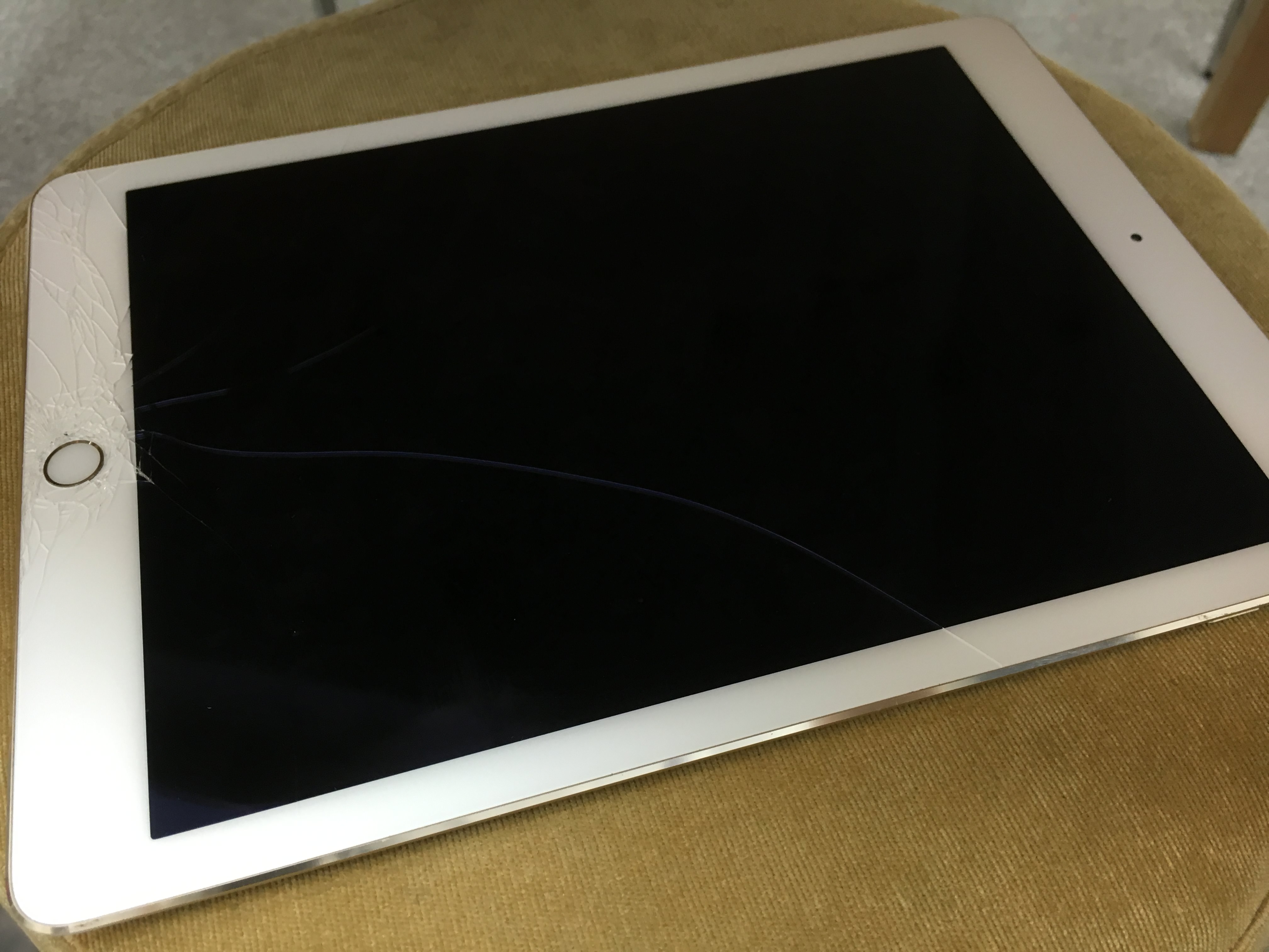 この通り、ホームボタンのあたりのガラスが粉々に砕けてしまっています。