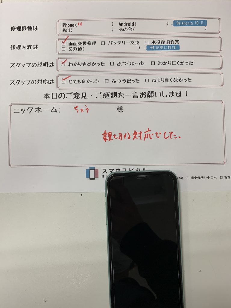 スマホスピタル横浜関内 iPhone11 画面交換にてご利用のお客様のコメント!