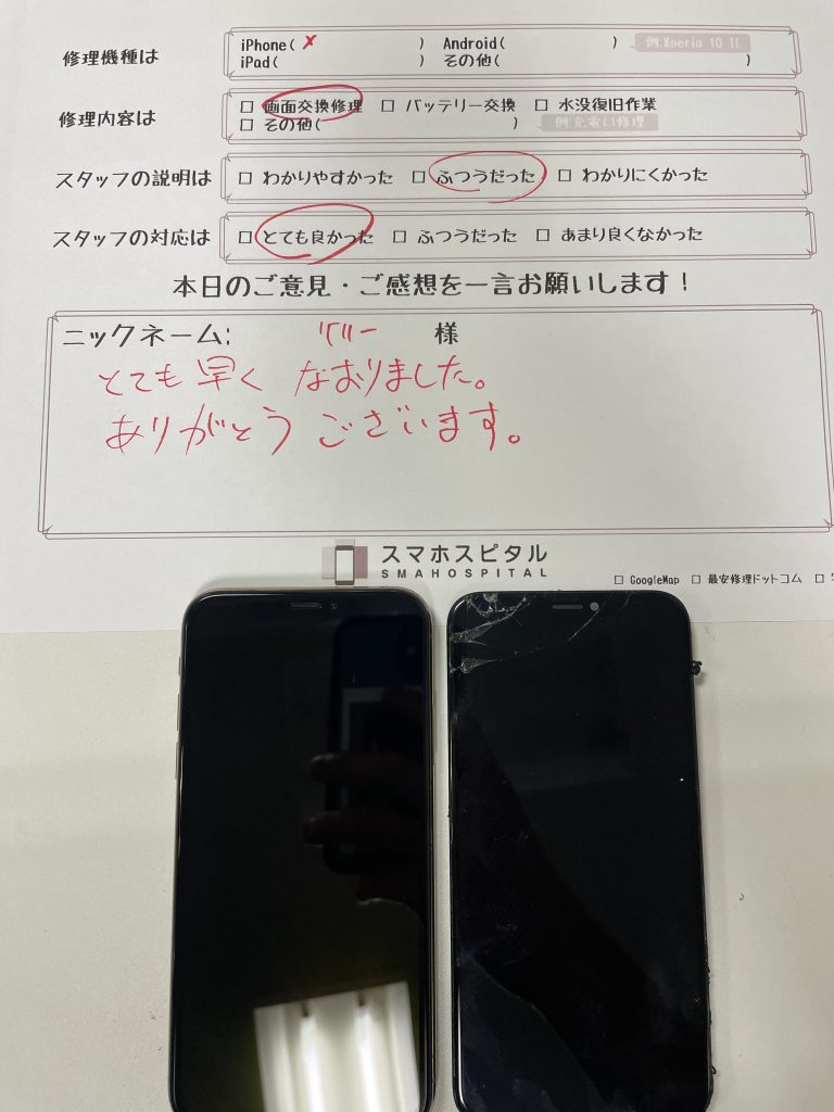 スマホスピタル横浜関内 iPhoneX 画面交換にてご利用のお客様のコメント!