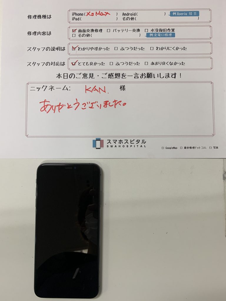 スマホスピタル横浜関内 iPhoneXsMax 画面交換にてご利用のお客様のコメント!