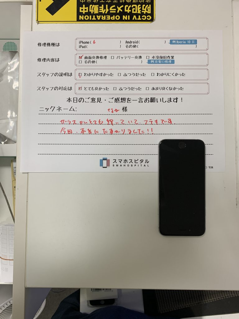 スマホスピタル横浜関内 iPhone6 画面交換にてご利用のお客様のコメント!