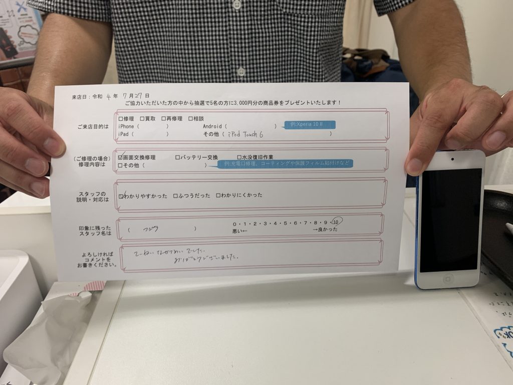 スマホスピタル横浜関内 iPodTouch6 画面交換修理にてご利用のお客様からのコメント!