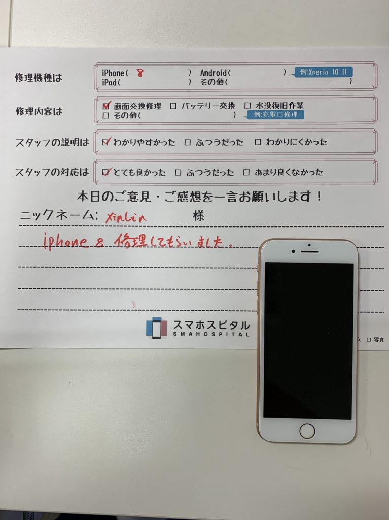 スマホスピタル横浜関内 【iPhone8】画面交換修理にてご利用のお客様からのコメント!
