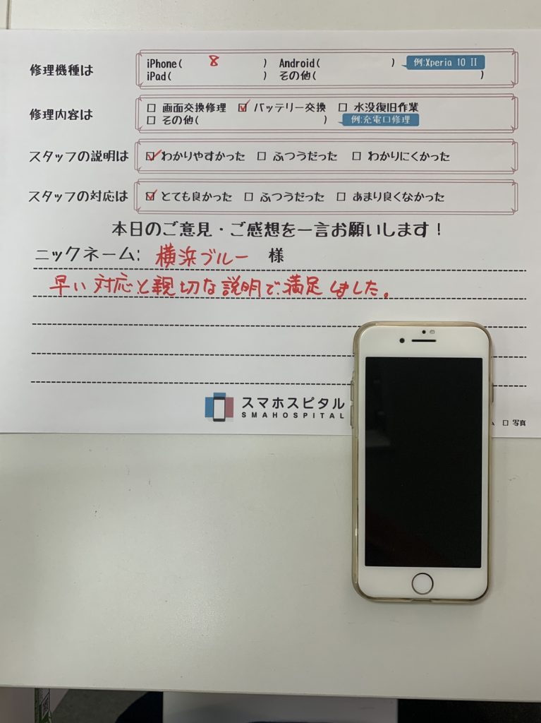 スマホスピタル横浜関内 【iPhone8】劣化でリンゴループするバッテリー交換修理!