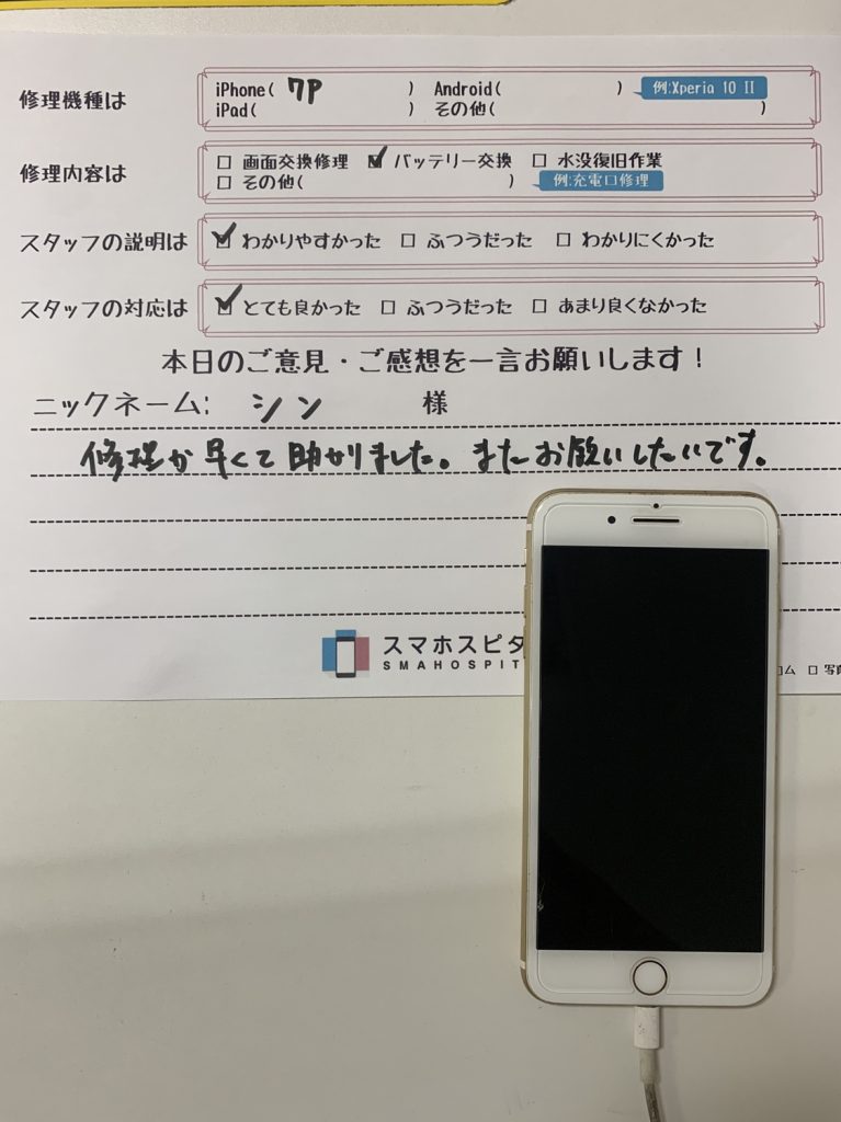 スマホスピタル横浜関内 【iPhone7Plus】バッテリー交換にてご利用のお客様からのコメント!