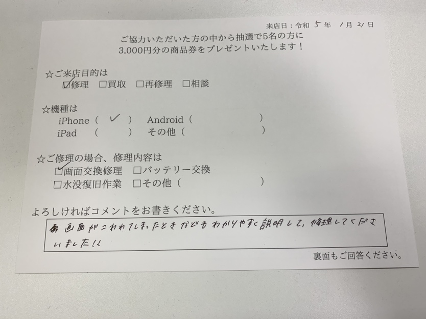 画面がこわれてしまったときなどもわかりやすく説明して、修理してくださいました!!
