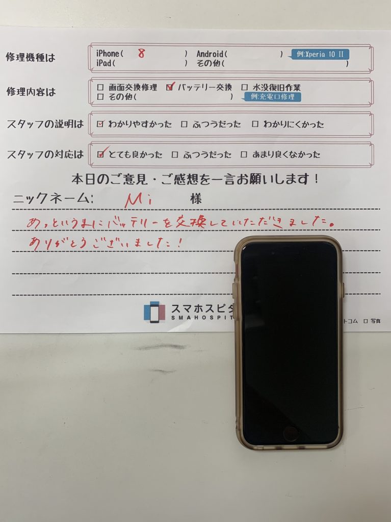 スマホスピタル横浜関内 【iPhone8】バッテリー交換にてご利用のお客様からのコメント!