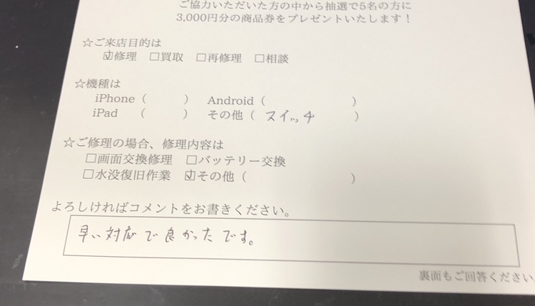 iPad 第6世代 バッテリー交換にてご来店のお客様からコメントをいただきました。