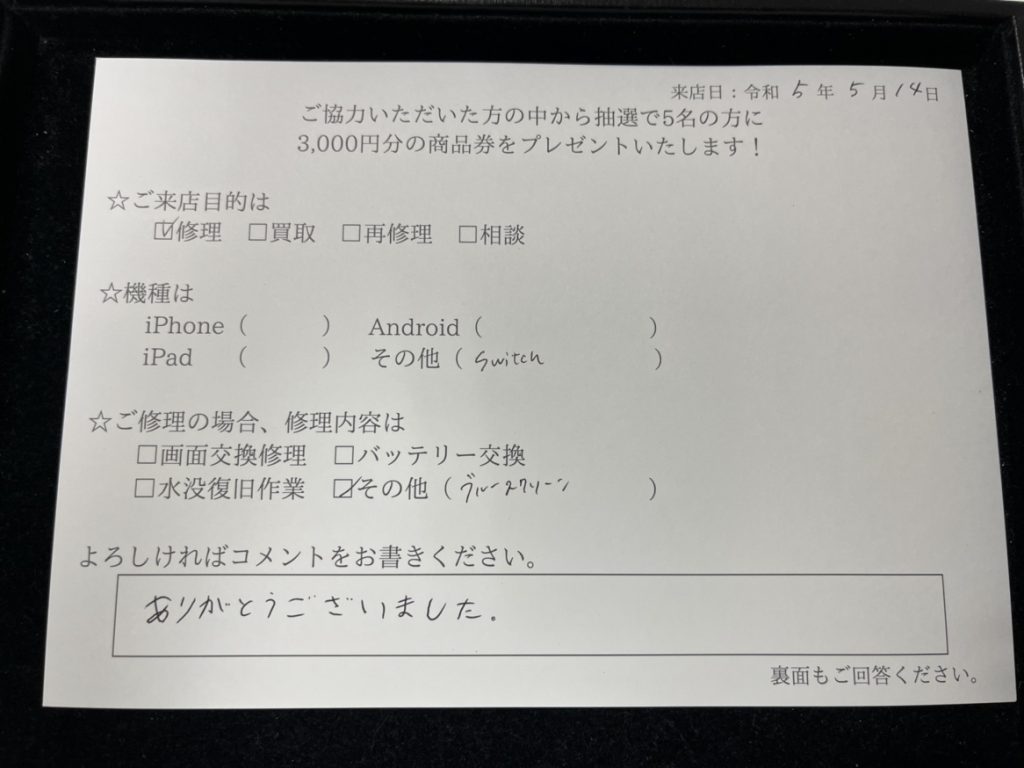 スマホスピタル横浜関内 Switch基板修理ご依頼の方からのコメントです!
