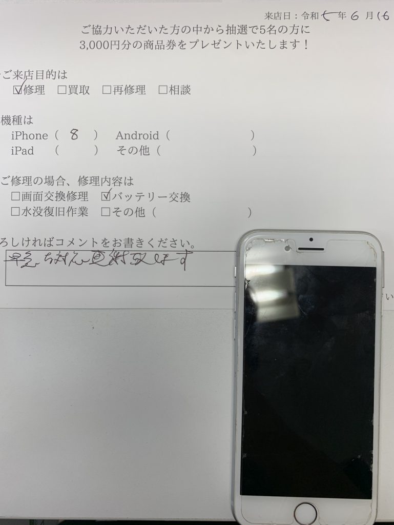 スマホスピタル横浜関内 iPhone8のバッテリー交換をされたお客様からコメントをいただきました!
