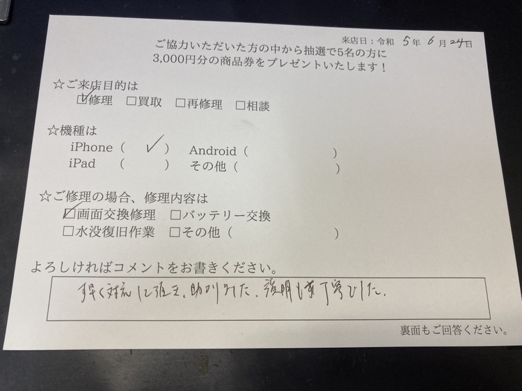 iphone11pro画面修理 お客様よりコメントを頂きました。