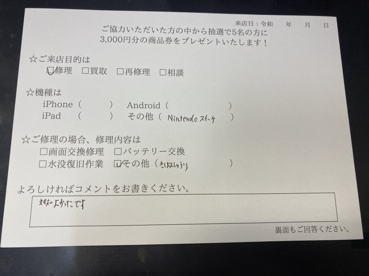 基板修理にてお返ししたSwitchの感想をお客さまよりいただきました!
